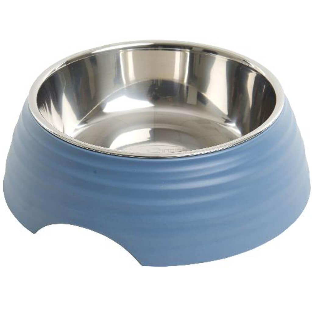 Buster Frosted skål Flot og stilfuldt design Med ”riller” Lækker melamin yderskål med rustfri skål indsats Gummi fødder hvilket giver anti-skrid funktion Skålen kan tåle at komme i opvaskemaskinen Til foder eller vand Ø 16cm Passer til Mellem