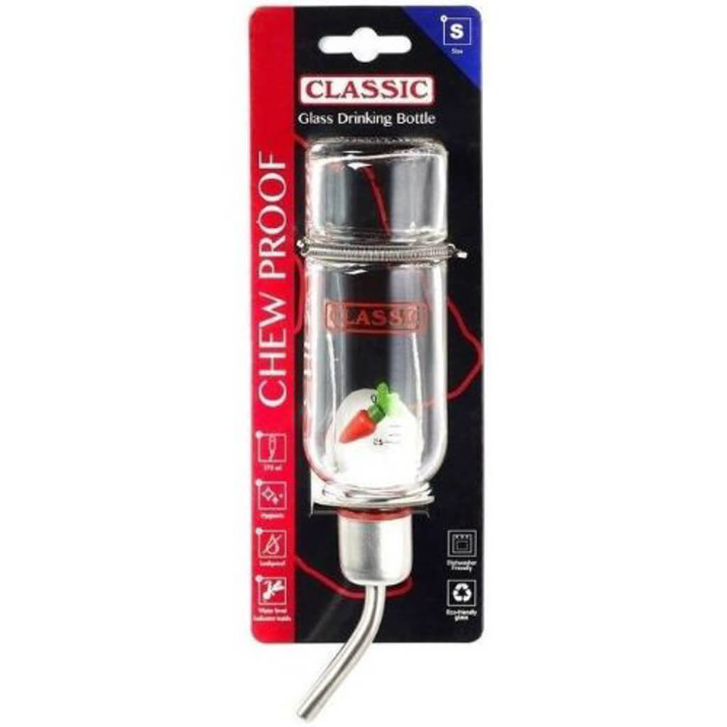 Drikkeflaske i glas Med drypfri tud Kan ikke tygges i stykker Fremstillet af miljøvenligt glas Vandidikator viser hvor meget vand der er tilbage Med en “gulerod” indeni for at undgå dryp Solid holder til buret Kan gå i opvaskemaskinen Størrelse sm