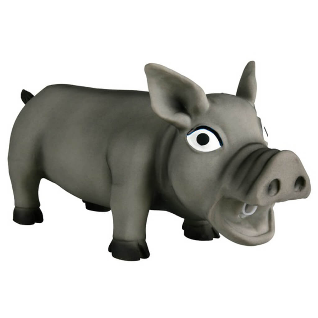 Sjov latex gris med orginal stemme- hvilket vil sige den lyder som en gris der grynter (stort piv) Grisen Øffer når hunden trykker den på maven Kan bides i stykker hold derfor øje med din hund og fjern produktet hvis dette går i stykker 23cm lang levers a