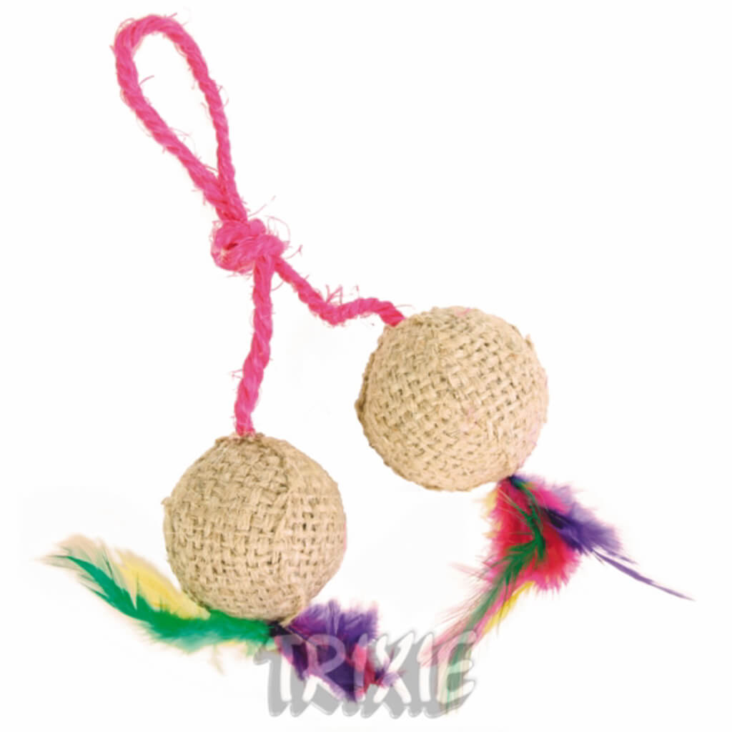 Disse bolde er lavet i kratigt jude. Med catnip indeni for at give katten en ekstra fornøjelse Der er fæstnet fjer i bunden af boldenene for at aktivere kattens jagt instinkt. De 2 bolde Er bundet sammen med en snor