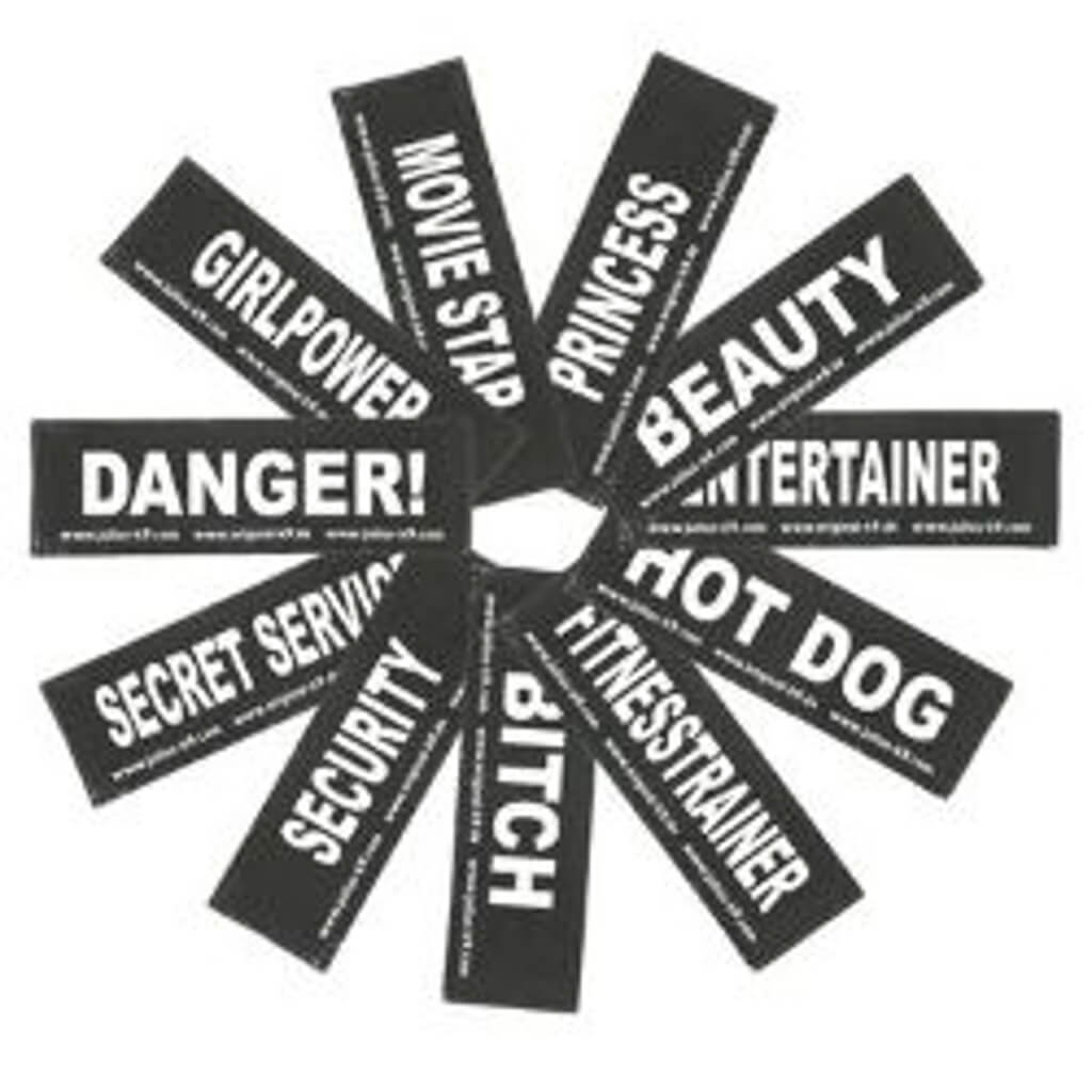 Labels som passer til Julius K9 selerne Størrelse Large passer til str. 0-4 kan nemt udskiftes pga. velkro med hvide selvlysende bogstaver mange sjove tekster som giver din hund dens eget personline præg