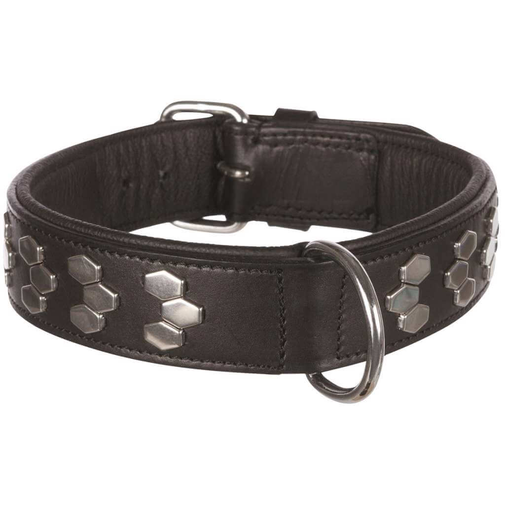 Flot læder halsbånd med nitter til store hunde Forkæl din hund med dette flotte læderhalsbånd med flade nitter. Halsbåndet er lavet med en blød bagside som gør halsbåndet komfortabelt for hunden at have på samtidigt med at man skåner pelsen. Dette halsbå