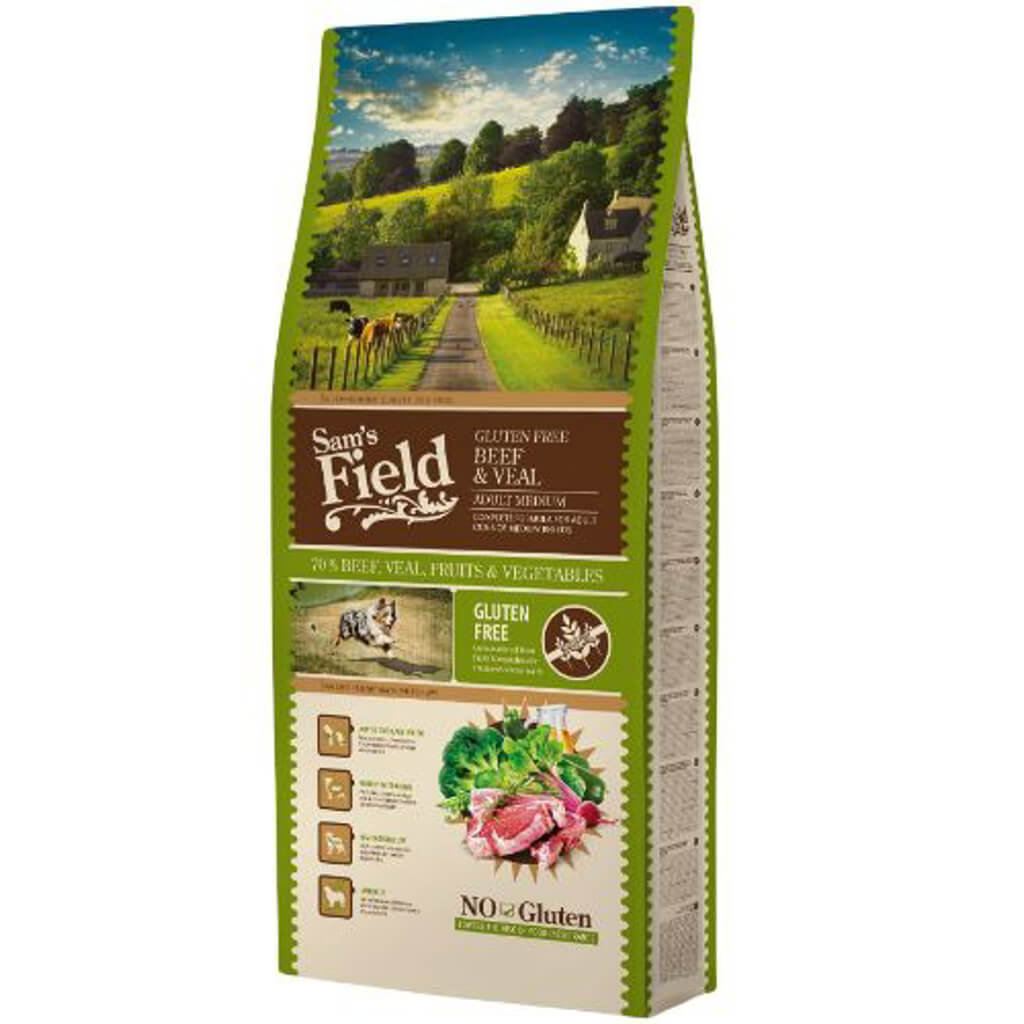 Sam’s Field GlutenFree Medium Beef & Veal Premiun foder med 70% okse, kalvekød, frugt og grøntsager Minimerer risiko for foderintolerence Råvarerne er skånsomt tilberedt Opretholder stabilitet i fordøjelsessystemet 13kg Sam´s Field GlutenFree er et s